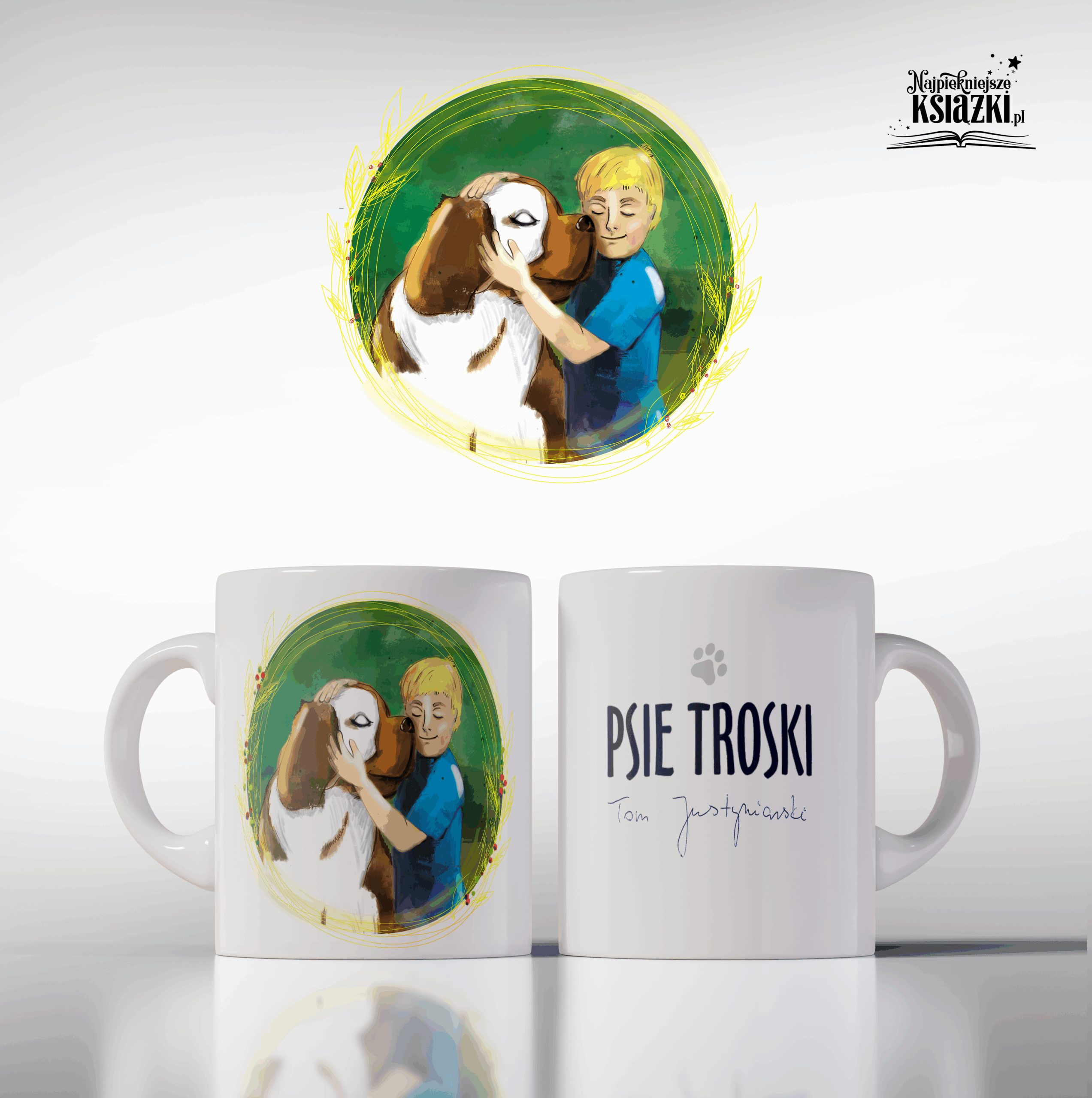 Nadruk na kubku zawiera ilustrację z okładki książki „Psie troski” po jednej stronie oraz podpis autora i tytuł książki po drugiej stronie. Nadruk jest wykonany w wysokiej jakości, dzięki czemu kubek zachowuje swój wygląd przez długi czas.