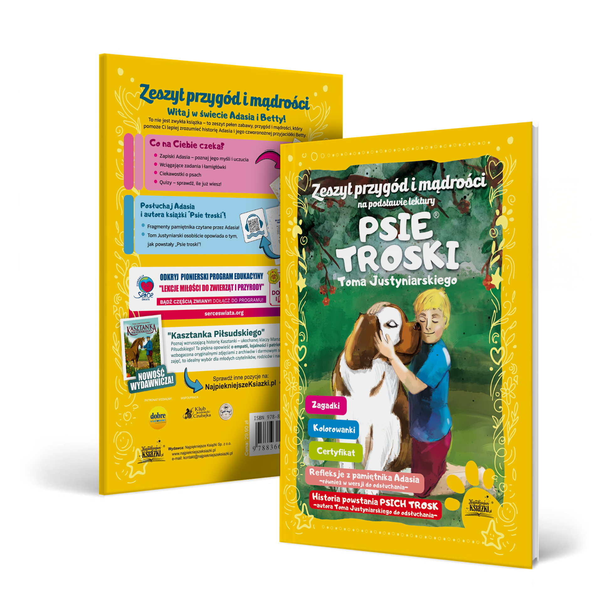 Zeszyt Przygód i Mądrości to wyjątkowy dodatek do lektury „Psie Troski” Toma Justyniarskiego, który łączy naukę z zabawą. Zawiera fragmenty pamiętnika Adasia, kolorowanki, zagadki i quizy nawiązujące do treści książki. Po zeskanowaniu kodu QR można odsłuchać historie czytane przez Adasia oraz usłyszeć, jak powstały „Psie Troski” w opowieści samego autora. W środku znajdziesz także Przykazania ZwierzątCertyfikat Przyjaciela Zwierząt – idealne narzędzie do budowania empatii i odpowiedzialności u dzieci.